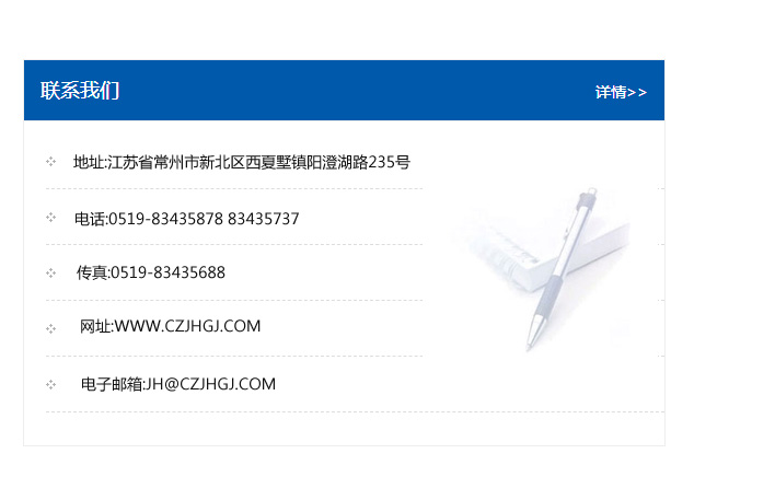 地址:常州市新北區友邦商務大廈1幢16、17層  電話:0519-85101652  傳真:0519-85112595  郵編:213022  網址:www.cz-jiayue_cn.zdzht.com  郵箱:xiajifengaa@163.com